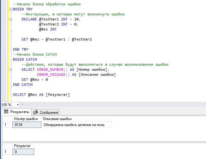 В Transact-SQL для отслеживания и перехвата ошибок реализована конструкция TRY CATCH, которая позволяет нам обрабатывать исключительные ситуации, иными словами, непредвиденные ошибки в своих SQLинструкциях. TRY CATCH – это конструкция языка Transact-SQL для обработки ошибок. Все, что Вы хотите проверять на ошибки, т.е. код в котором могут возникнуть ошибки, Вы помещаете в блок TRY. Начало данного блока обозначается … Продолжить чтение Конструкция TRY CATCH в T-SQL